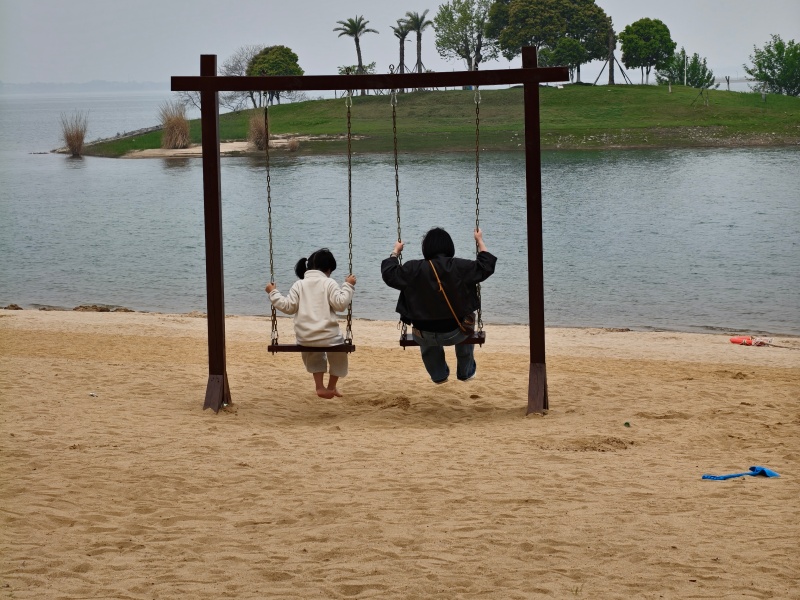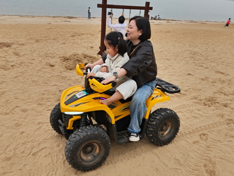 中午简单吃了点东西,下午转场到阳光沙滩。娃刚开始只对里面的滑梯感兴趣,还是我强行把她丢到沙滩上面她才进去状态,蹲在那儿玩了好久,堆沙、踩沙,玩得不亦乐乎。后来妈妈扫了一个沙滩摩托,小家伙坐在上面特别开心,全程兴致很高。